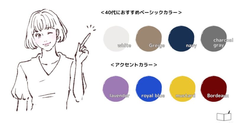 40代女性におすすめのベーシックカラーはホワイト、グレージュ、ネイビーチャコールグレーです。