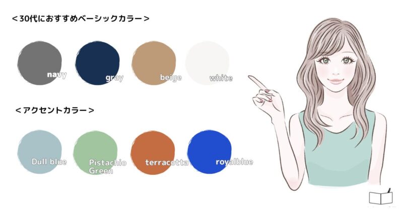 ベーシックカラーだけでは地味になってしまう人はくすみブルー、ピスタチオグリーン、テラコッタを挿し色に使うと肌馴染みもよく派手になり過ぎません。
