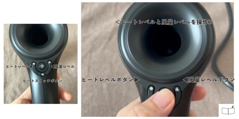操作はとても簡単で、電源ボタンを押したあとは「ヒートレベルボタン」と「風量レベルボタン」を調節しながら髪を乾かします。