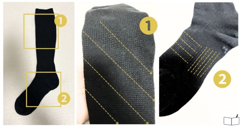 らく圧ソックスの特徴的な、ふくらはぎと足の甲部分の素材を分かりやすくするため❶と❷の画像に黄色でマーキングしてみました。