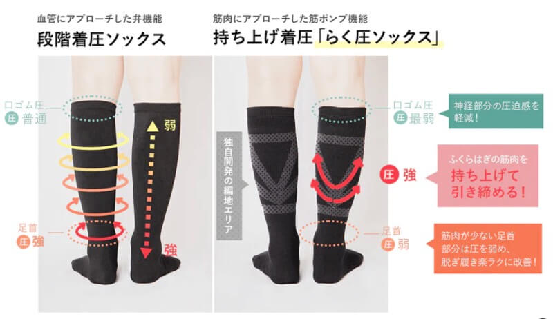 老舗靴下メーカー「助野」が開発したらく圧ソックスは、着圧ソックス特有の「履きにくさ」を解消した画期的な一足です。